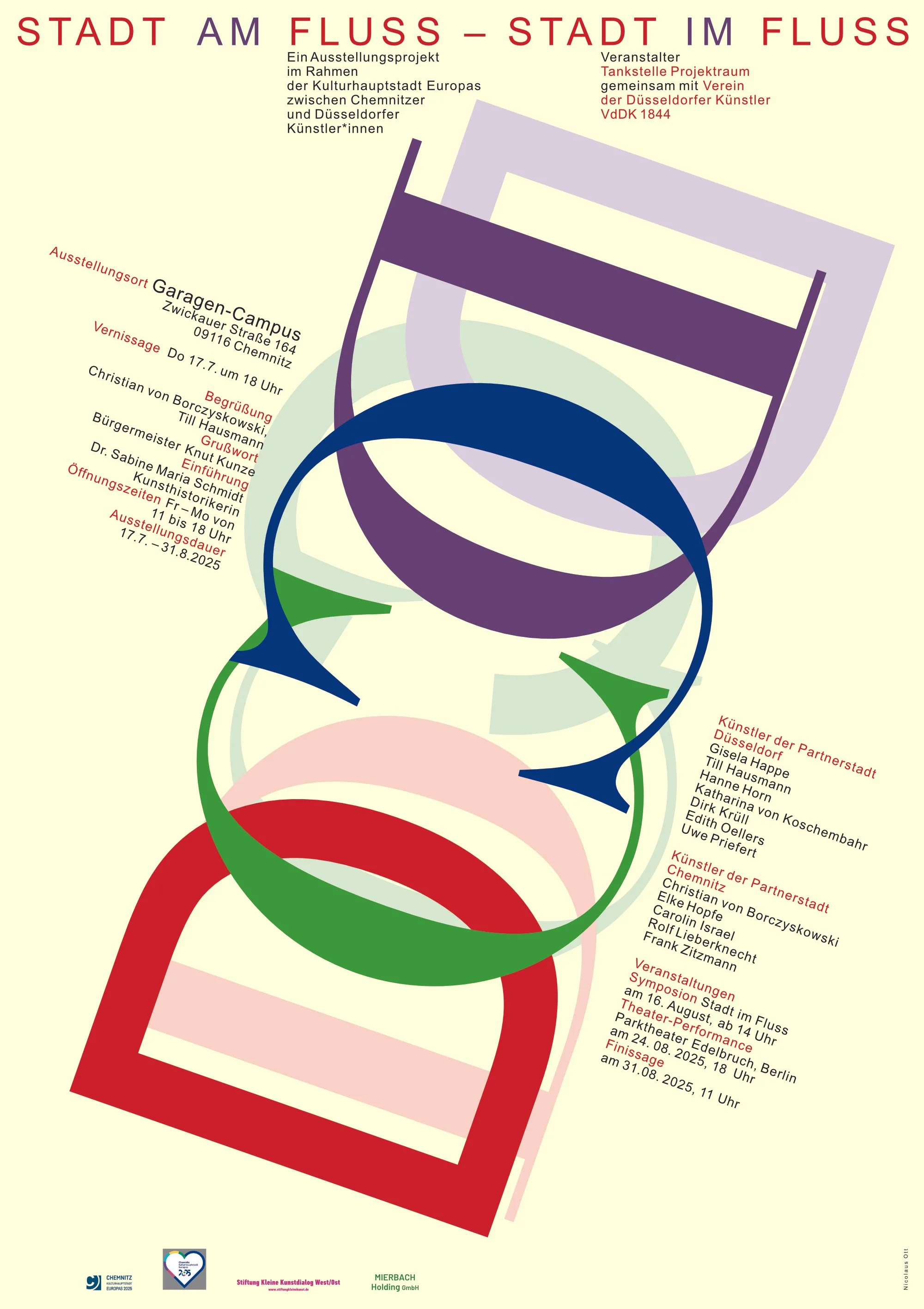 From August 7 to 29, the Johanna Ey Foundation will present contemporary perspectives on the project “City on the River – City in the River” in the heart of Düsseldorf. The exhibition project is part of the official program of the European Capital of Culture Chemnitz 2025. Since July 17 and continuing through August 31, seven artists from Düsseldorf have been exhibiting together with local artists at the Garagencampus in Chemnitz (www.tankstelle-projektraum.de). “The opening was a great success — the Garagencampus was packed,” reports Düsseldorf sculptor Till Hausmann. And while the exhibition in Chemnitz is still in full swing, another show featuring the same artists will open on August 6 in the partner city of Düsseldorf.